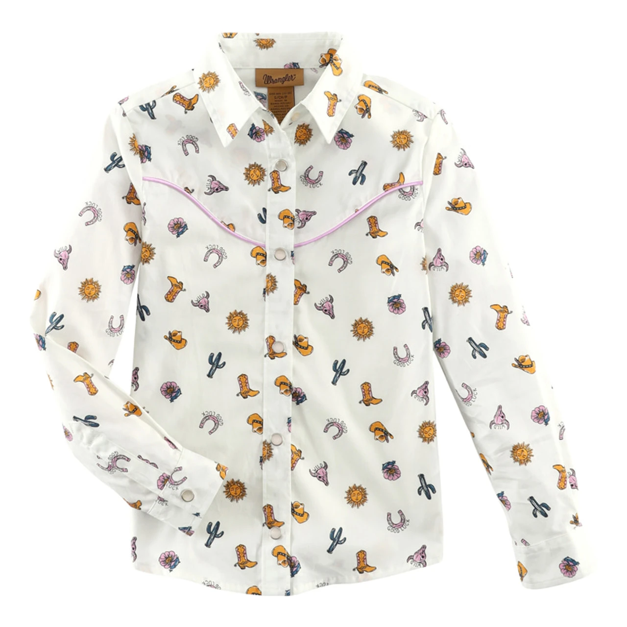 A cowgirl’s closet isn’t complete without a classic snap shirt. The Wrangler girl’s long-sleeve western snap shirt features an embroidered yoke and horseshoe, boots and flowers all over design. It’s crafted from cotton poplin to keep her comfortable from morning to night and it comes with genuine pearl snaps for an extra touch of western authenticity. All she needs to complete the look is her favorite pair of Wrangler jeans and some cowgirl boots. Fit: Regular Sleeve Length: Long Front Closure: Snaps Collar: Spread 100% Cotton Poplin