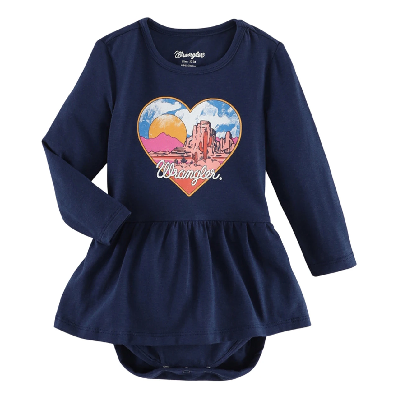 Cowgirls are as tough as they come. Your little outlaw will earn her spurs from the start with this little girlâs long-sleeve graphic bodysuit. Itâs crafted from a soft cotton blend with just a hint of stretch to keep her comfortable as she explores new frontiers and plays until sundown. It features a sunset desert graphic with wrangler logo. It also features a ruffled hem for a little bit of flair and a snap closure for easy diaper changes. Fit: Slim Leg: Snap seat closure Sleeve Length: long Neckline: Crew