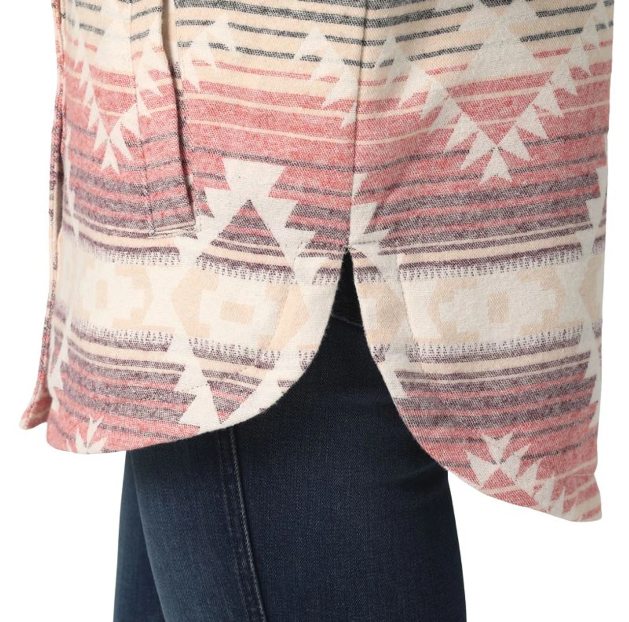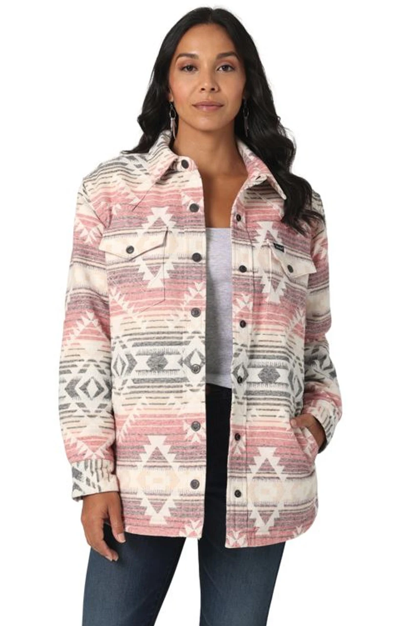 When your signature denim deserves a break, the Women’s Wrangler Retro Southwestern Print Shacket can do no wrong. It’s crafted from 100% cotton jacquard fabric with a printed Western-inspired pattern. This women’s shirt jacket comes with pointed yokes, a longline silhouette, a full snap closure, and two chest flap pockets with the signature “W” stitching.