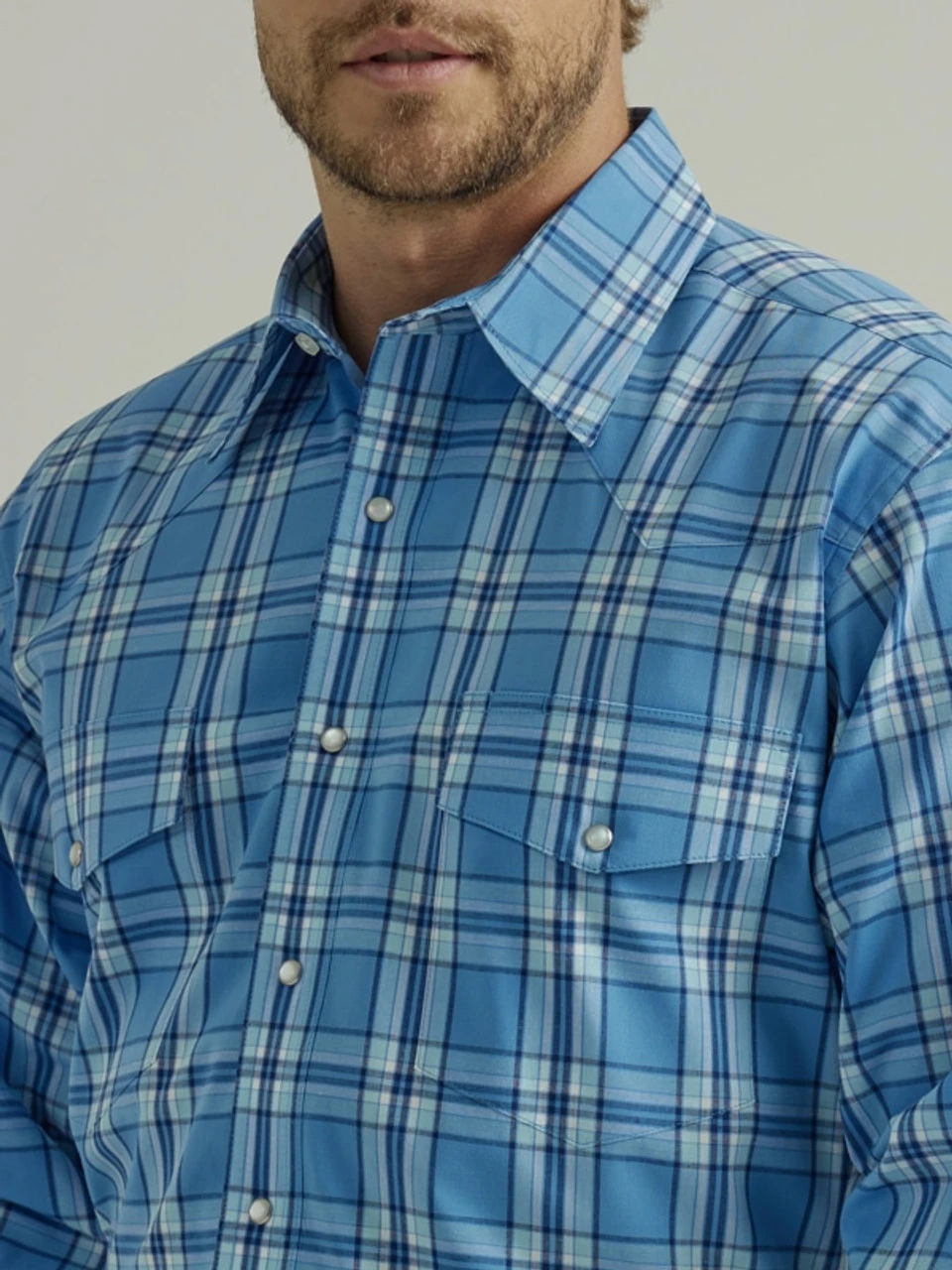 Everycowboy needs a dependable button-down he can wear any day of the week. Luckily, the men’s long-sleeve button-down two-pocket plaid shirt comes fully equipped with everything you need to make your mark. It’s made of a blend that feels just as good as it looks. This classic plaid button-down features a relaxed fit, a pointed collar, a western back yoke, two button-through chest pockets and adjustable cuffs. Wear yours with one of the Wrangler Cowboy Cut jeans to complete your look for any occasion. Fit: Relaxed Sleeve Length: Long Front Closure: Buttons Front Pockets: Two with button-through Back: Straight Back Yoke with Pleat Collar: Button Down Cuff: Two Button Adjustable