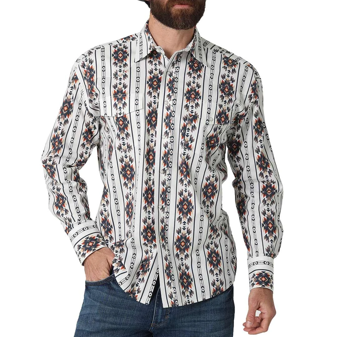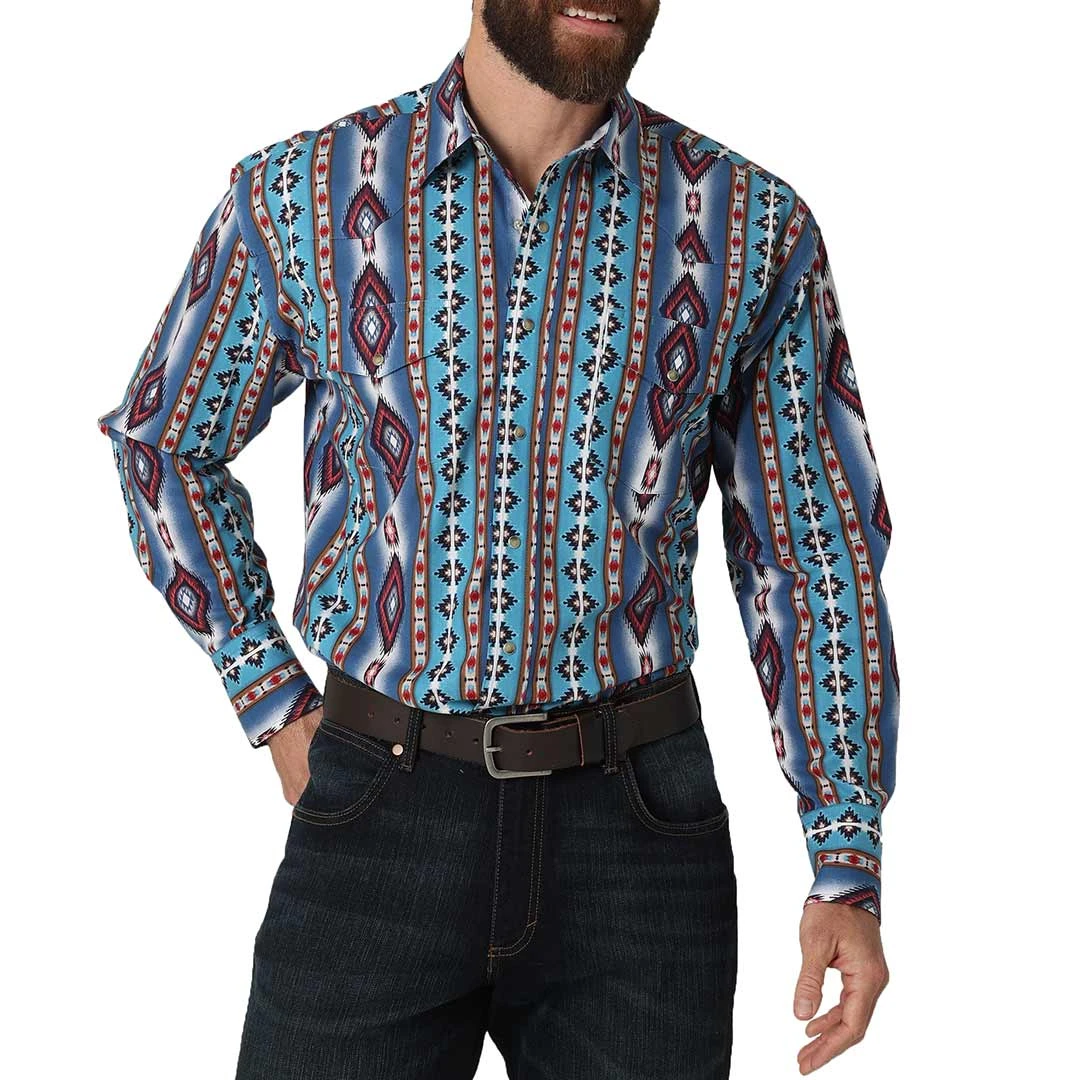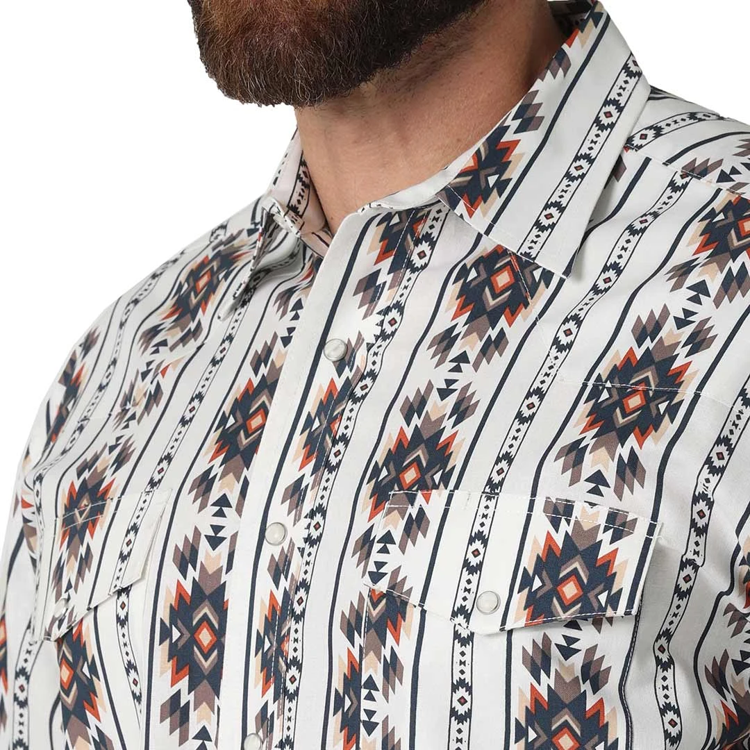 Wrangler’s Checotah has a home in the closets of cowboys around the world. This men’s Checotah long-sleeve western snap Navajo-inspired printed shirt is designed to make a statement no matter the destination. It features a classic fit, a spread collar, pointed yokes, two snap flap pockets with a convenient pencil slot, adjustable cuffs, and a full-length snap closure for the finishing touch. Best of all, it’s crafted from cotton for uncompromising comfort. Look sharp at a moment’s notice by wearing your Checotah shirt with a Wrangler Retro or Cowboy Cut jeans.
