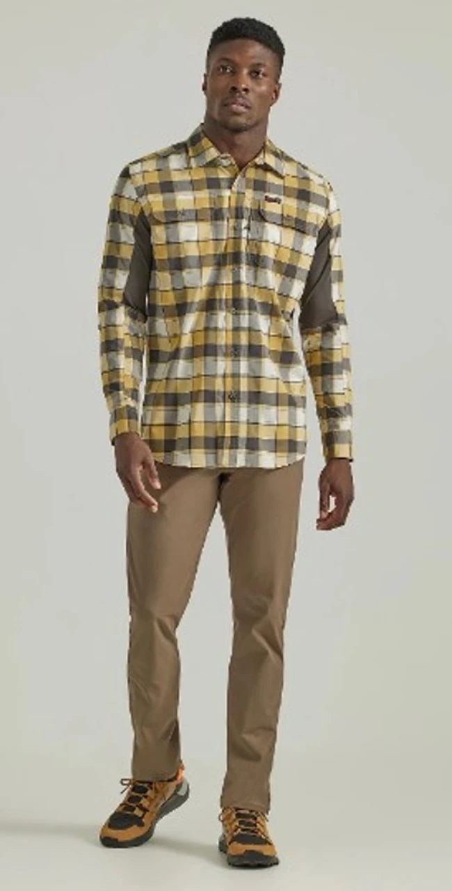 From the backyard to the backcountry, the ATG by Wrangler⢠plaid mixed material shirt has your back. It’s crafted from a breathable blend of cotton, recycled poly, and a little bit of stretch to keep you flexible on the fly. This long-sleeve shirt comes with everything you need to take on the great outdoors, including a convertible sleeve system for versatility, ventilation at the back yoke, a glasses cleaner at the hem, UPF 30, and a moisture-wicking membrane to keep you dry despite the forecast. It also features two chest pockets with flaps and buttons as well as a zip utility pocket for any extra essentials you want to take along. Wear it with our All-Weather jean to complete the look and make the most of every adventure.