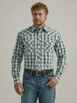 Wrangler Mens Long Sleeve 20X Snap Down Brown And Teal Plaid Shirt