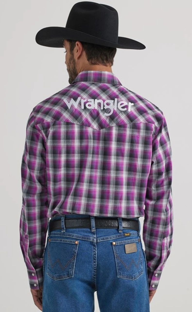 Wrangler Mens Western Purple Plaid Long Sleeve Western Logo Shirt