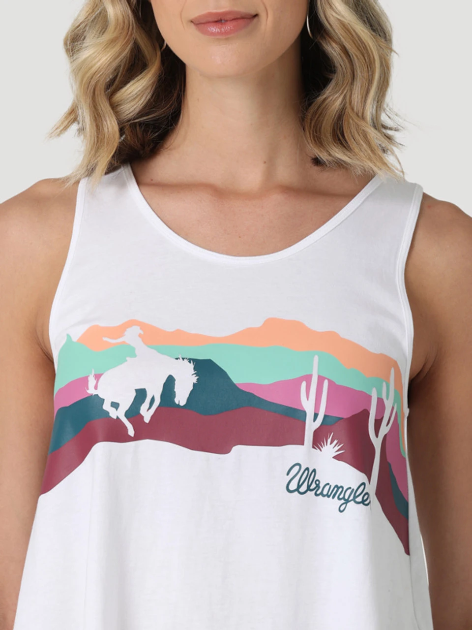 Nothing says summertime like cutoffs and a tank top. Luckily, our women’s Wrangler Retro sunset ridge handkerchief tank has that Western look and feel you love in a silhouette that’s perfect for warm days. It’s crafted from cotton to keep you comfortable. Across the chest, it features a bold print of a cowgirl on horseback set against a sun-soaked mountain range. Fit: Relaxed Sleeve Length: Sleeveless Neckline: Round Waist Hem: Handkerchief 100% Cotton