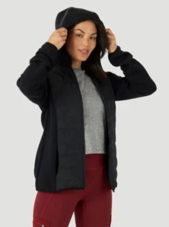 Lightweight and easy to pack for every outdoor experience, the ATG⢠by Wrangler womenâs hybrid jacket is everything you need in an outdoor staple. The hooded jacket features a zippered closure and zippered hip pockets, raglan style sleeves, and an insulated puffer jacket center at the front for added warmth. Its princess seams and stretchy fabrication ensure a comfortable fit that flatters so you can wear it on the trail and in the city.