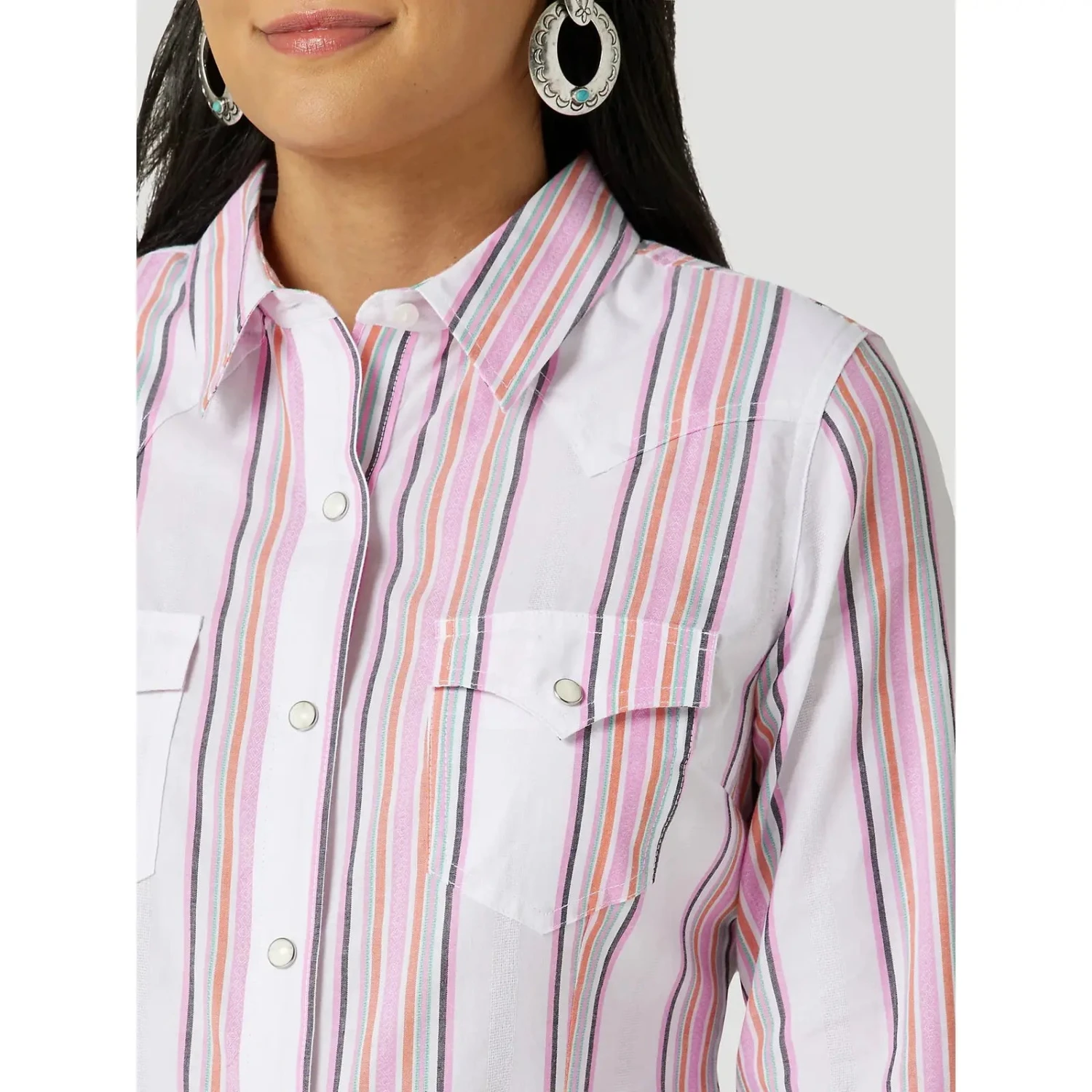 Tucked in or left untucked, nothing can compete with Western snap shirts. When it comes to adding the finishing touches on your outfit, we have you covered with Western-inspired long-sleeve, two-pocket snap stripe shirts from the Wrangler® Retro® collection. These women’s Western shirts come with all the bells and whistles you’d expect from a genuine Wrangler® classic, including pointed front and back yokes, snap flap pockets, and pearl snaps. Plus, these Western shirts for women have been cut on a bias for subtle tailoring and a slim silhouette.
